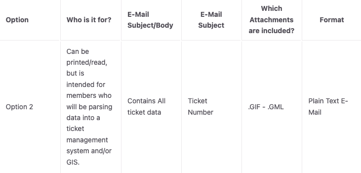 Although it can be printed and read, it is intended for members who will be parsing data into a ticket management system and (or) GIS. The email body contains all the ticket data and includes both a .GIF and .GML file as attachments.