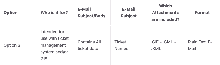 Intended for use with ticket management system and/or GIS, the email body contains all ticket data with each of .GIF, .GML, and .XML files as attachments.